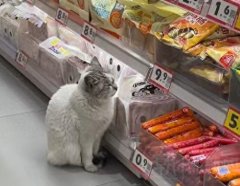 小猫定时蹲守火腿肠