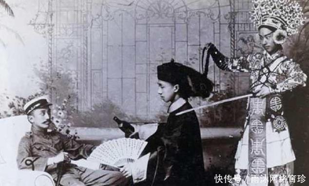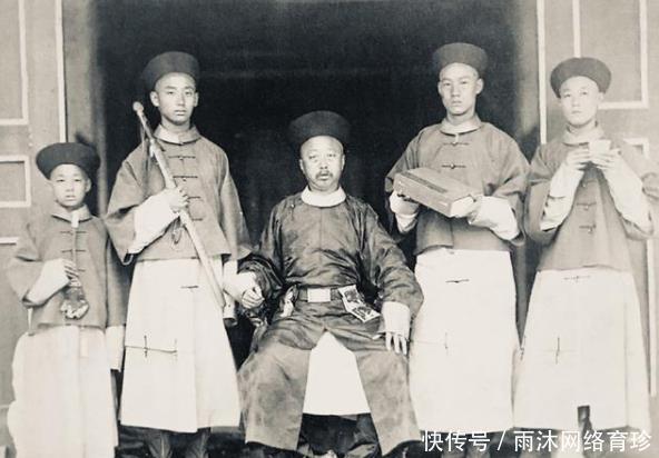 一位穿清朝官服的中国人跪在地上,给外国兵倒酒,后面还站着一个人,整个照片带着侮辱的性质,太令人愤怒了!