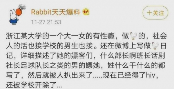 尽管目前微博@小姆苟呢已经被封,但其之前的卖淫日记却被保存,里面详细地描写了卖淫、YP的过程和感受。微博日记中从对自己的称呼,到详尽的心理描写,都看不到一点基本的自尊心。对一些黄色场景的细致描写,看似是追求刺激和性快感,同时也表现出她内心的自我形象已经崩塌毁灭了,不再有基本的羞耻和自尊,不再有独立完整的人格。