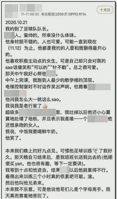 此事第二天,10月21日,她又约到了足球队队长。对此,她称这次约到的男生是目前为止聊的最开心的