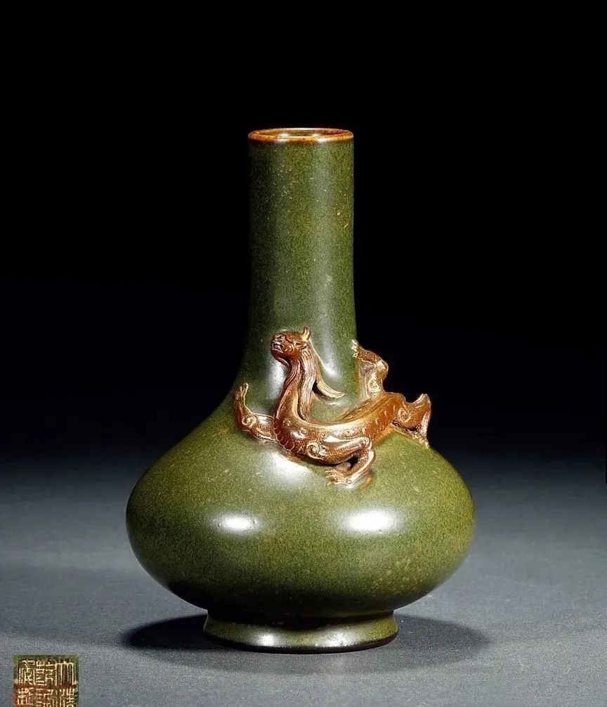 清乾隆?茶叶末釉描金盘螭长颈瓶