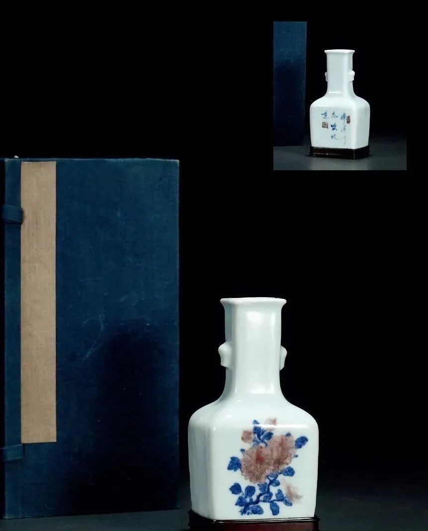 清乾隆?青花釉里红花卉诗文双耳瓶