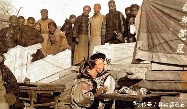 照片中的两位打扮比较好看的妇人是宫里面的宫女,出宫办事,在街边休息。