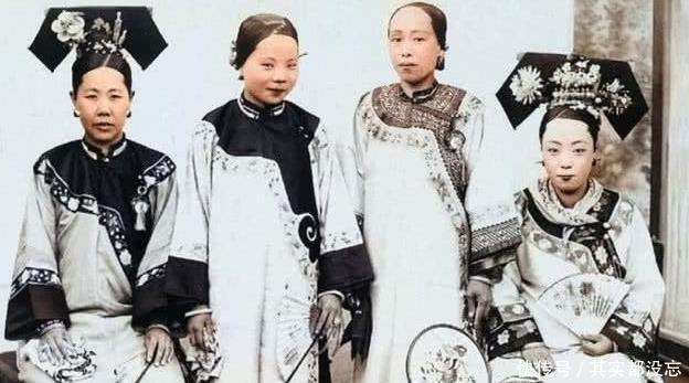 图为清朝的格格们在拍摄照片,旁边两位格格梳着传统的旗头,衣着华丽。