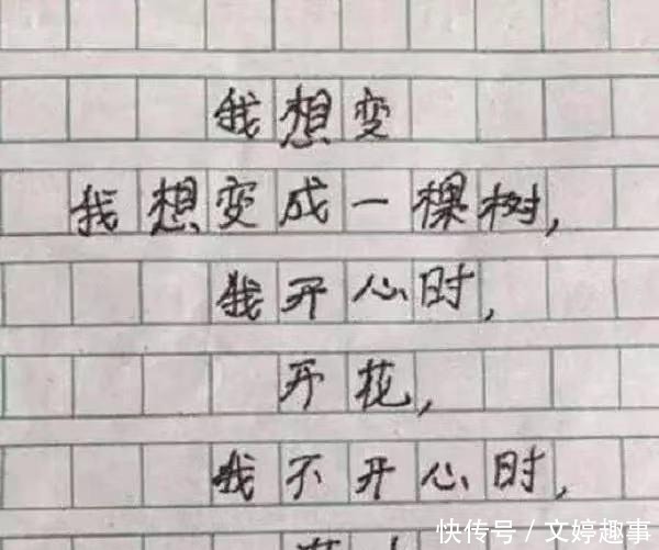 7、这位小学生写的诗还是很正经的,这样的诗句着实让小编很佩服呢,小小年纪就有如此的文采,长大之后一定不得了啊,真是让人自愧不如,诗中写出自己想变成一棵树,这样的比喻手法还是很忧伤的,开心时就开花,不开心时就落叶,确实是很忧郁的。