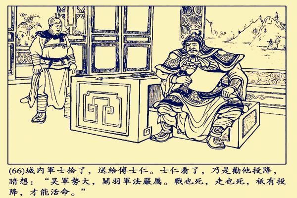傅士仁投降后,孙权让他招降同伴糜芳。傅士仁二话不说,前去南郡招降糜芳。如果没有损友傅士仁的招降,糜芳还不一定投降,依托坚固的南郡城,和吕蒙大军决一死战,鹿死谁手,犹未可知。演义中相关描述如下: