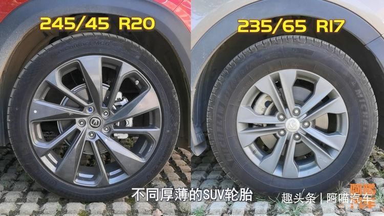 现在很多新上市的车子,为了追求炫酷的效果,轮毂是越用越大,轮胎也是越用越薄。那么我们这个家用车的轮胎,到底是厚一点好还是薄一点好呢?两个不同厚薄的SUV轮胎,扁平比为245/45 R20的轮胎,扁平比为235/65 R17的轮胎。245/45 R20的轮胎的胎体很薄,然后235/65 R17的轮胎胎体很厚。在视觉效果上245/45 R20的轮胎看上去,更为炫酷更为有张力,235/65 R17的轮胎看上去有点憨憨的。那么它们之间到底有多大的区别呢?