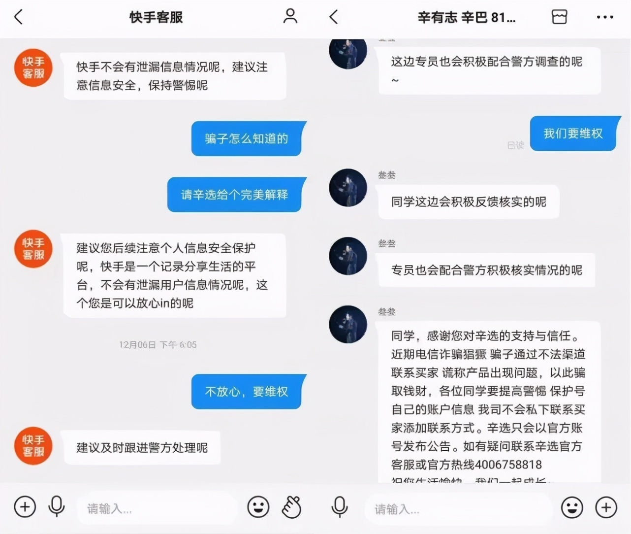 有多位受害者就信息泄露的问题分别联系辛选、淘宝、快手,三者都直言绝对保护客户个人信息,不会泄露。《财经》新媒体从辛选客服处了解到,辛选已为受害者登记并报警,目前在等待公安机关的处理。