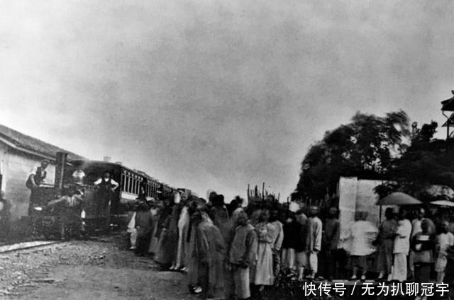 第七张照片很多人围着火车,观望这种新奇的交通工具。