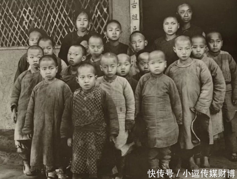 图为晚清年间福州某地学堂里的学童们的合影老照片,孩子们一脸严肃。