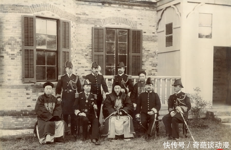 新娘凤冠霞帔,盛装出镜,如果是彩色照片,肯定非常耀眼。新郎穿补服,是一名官员。他们身后两位女子也衣着喜庆,或为伴娘。