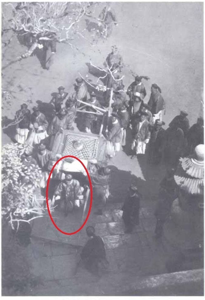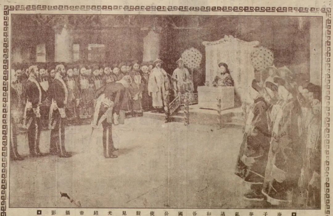 这两张图片,显然出自同一张照片。光绪皇帝虽然失去了"拍照自由",但慈禧无法阻止外国使节带着摄影师进入皇宫--早在1898年,德国亨利亲王来华觐见光绪时,已被许可由随从人员带着摄像设备入宫。于是得以留下了这样一张照片。遗憾的是,照片中的光绪,仍看不清面目。