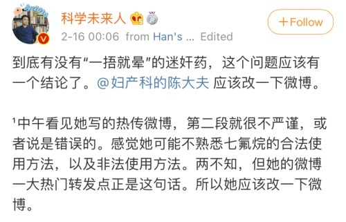 对此,科普博主@科学未来人 也称,@妇产科的陈大夫 的说法很不严谨,或者说是错误的,建议其修改博文,以免误导网友。
