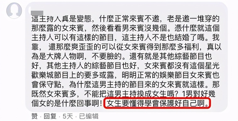 还有网友直接骂主持人,都结婚了还总是请穿着这么暴露的女明星,同时呼吁“女生要学会保护好自己”。