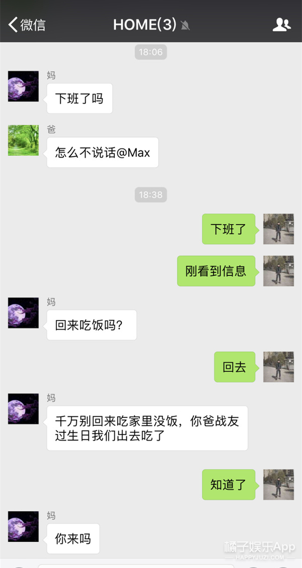 儿子开心的在群里说晚上回家吃饭,爸爸说,没做你饭,出去吃吧。