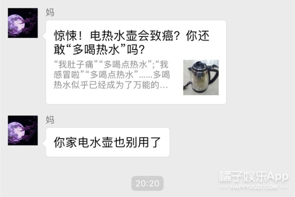 妈妈,"电热水壶致癌!"儿子,"假的!"不好意思,你已经被移出群聊。
