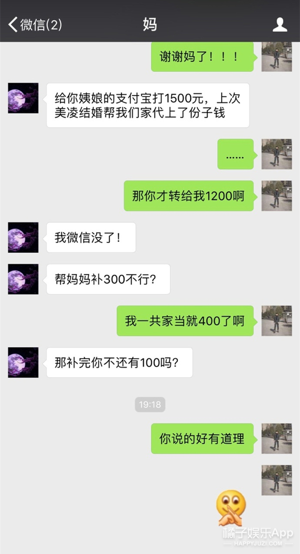 但是妈妈却冷漠的说,"给你姨娘的支付宝打1500元,上次美凌结婚帮我们家代上了份子钱。"儿子崩溃,"那你才给我转1200啊?"