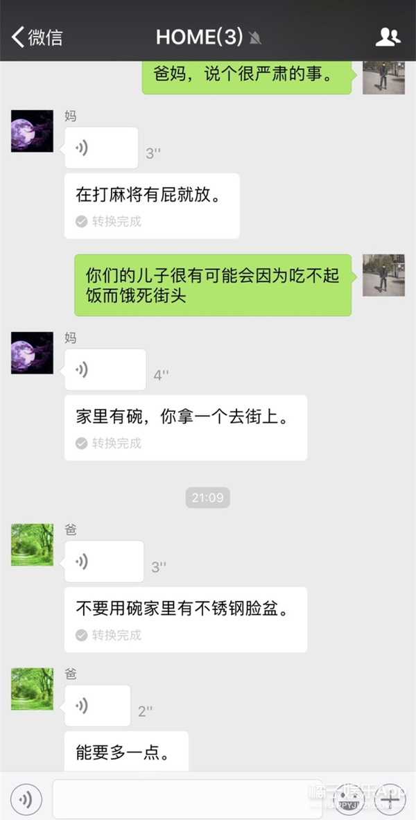 儿子哭穷说自己吃不起饭要饿死街头了,妈妈说家里有个碗去要吧,爸爸说不要用碗,家里有不锈钢脸盆,能要的更多。