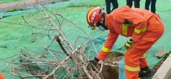 女子被救出之后,消防人员从附近找来了一些枯树枝,盖在了这个坑上以作警示,一面其他人发生意外。