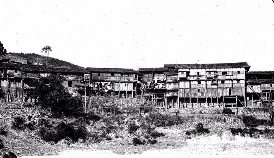 清末时期南方村落中的吊脚小楼,具有少数民族气息的房屋显得比较简陋