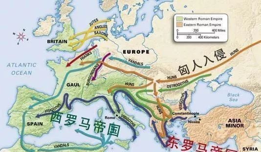 东汉时期,匈奴发生内斗,分裂为南北两部。南匈奴向南内附汉朝,活跃在汉朝边境一带。这支匈奴虽然实力较弱,但也不能小视,魏晋南北朝时期曾成为主要的边患之一。而留在蒙古高原的北匈奴则在汉帝国持续的打击以及趁虚而入的鲜卑人的攻击下被迫西迁。北匈奴沿着欧亚大草原辗转来到了欧洲,在欧洲兴风作浪,建立了强大的匈人帝国。匈人帝国东起咸海,西至大西洋,南起自多瑙河,北至波罗的海,疆域面积直追大汉帝国和罗马帝国。匈人帝国不断向周边发动进攻,连东罗马帝国都不得不向匈奴皇帝交纳贡税。
