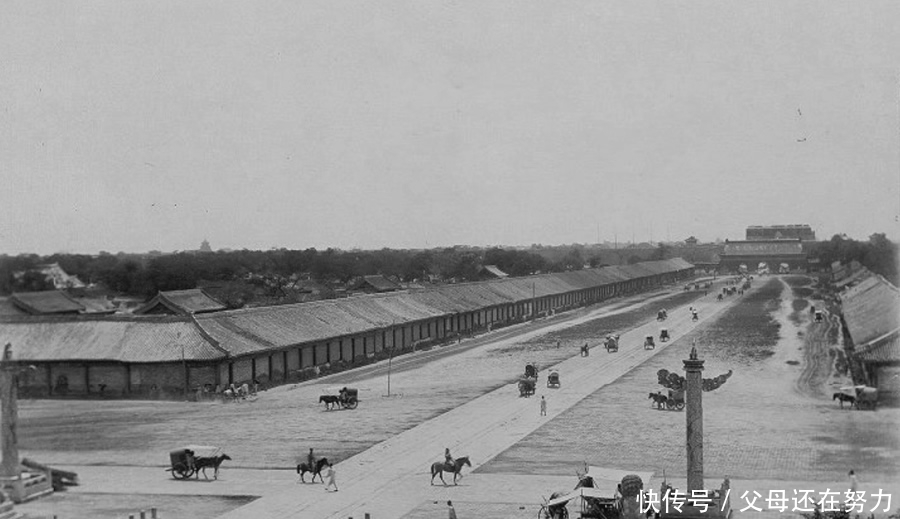 1901年,站在天安门城楼向南拍摄。在天安门与大清门之间,左右两侧各有廊房110间,称"千步廊",又东、西折有向北廊房各34间,东接长安左门,西接长安右门,皆连檐通脊。这里是六部、五府及军机事务等官衙的所在地,文官在东千步廊办公,武官在西千步廊办公。