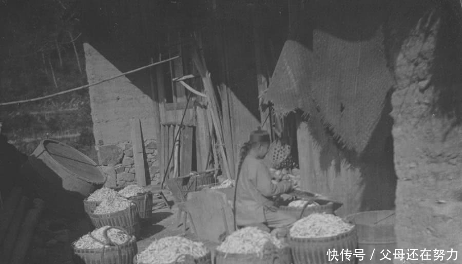 1905年,正在切红薯片的少年,他已经切了满满7筐。你知道他切红薯片做何用吗?秋天刚刚收获的红薯,切成薄片晒干,再磨成面。用红薯面烙饼、蒸窝窝头,是清朝、民国很多农民的主食;能在其中加一点白面,算是改善伙食。
