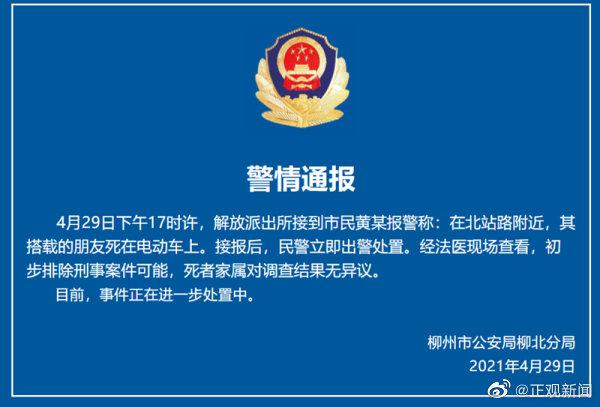 4月29日,广西柳州。一男子骑电动车载尸体的视频在网上流传。29日晚,柳州警方发布警情通报,解放派出所接到市民报警称,在北站路附近,其搭载的朋友死在电动车上。