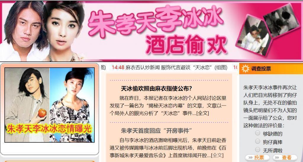 2004 年,朱孝天和李冰冰被拍到了 " 偷欢门 ",两人在酒店的电梯里搂抱、亲吻,视频一曝光就掀起了轩然大波,当时朱孝天说跟李冰冰是日久生情,而李冰冰没正面回应,只是说不想配合某些人炒作。更败好感的是,当时朱孝天是有日籍绯闻女友的,被骂劈腿。