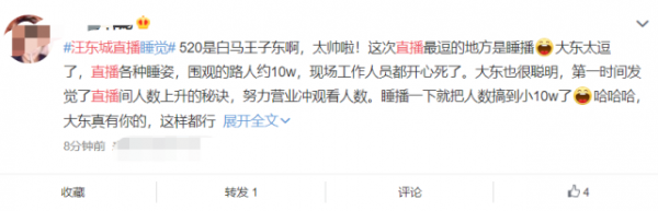 眼看汪东城被网友严厉批评,多位粉丝还原了当时的情况。从粉丝澄清的发文能得知,汪东城并非是真的睡着了,而是为了直播效果才装睡的,何况汪东城从下午6点直播到半夜长达7个小时,都没有一句怨言,因为看到直播人数不是很好,体恤主持人,才想出了这么一个方法,结果效果意外的好,也让直播观看人数猛增。