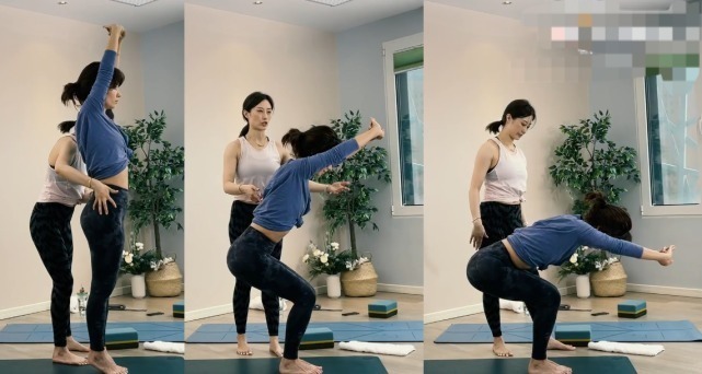 在练习一些难度比较大的健身动作时,教练会在旁边帮助卢靖姗纠正,让她尽可能的取得最好的健身成果。