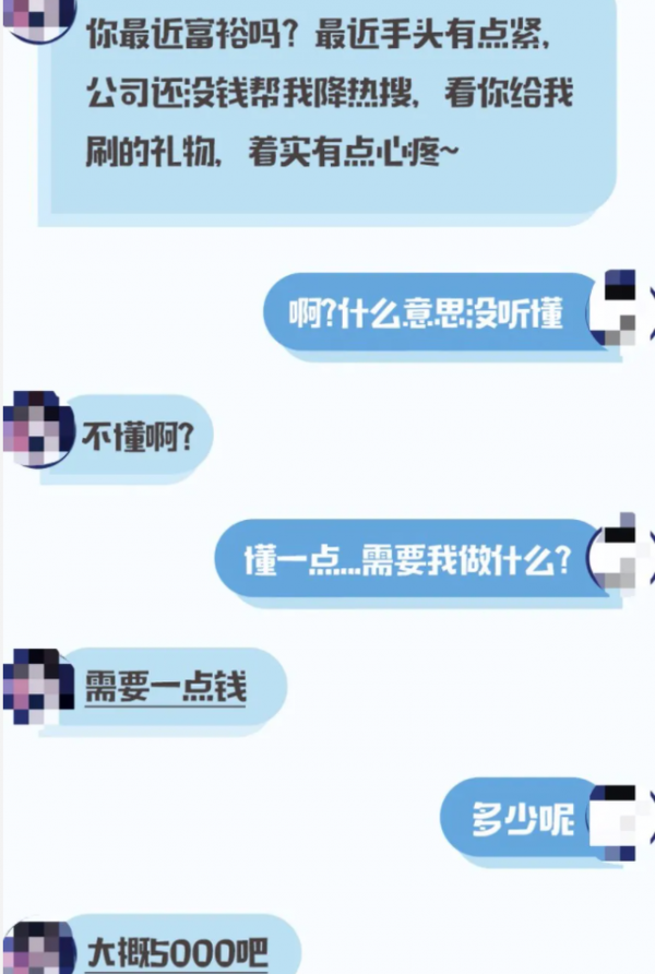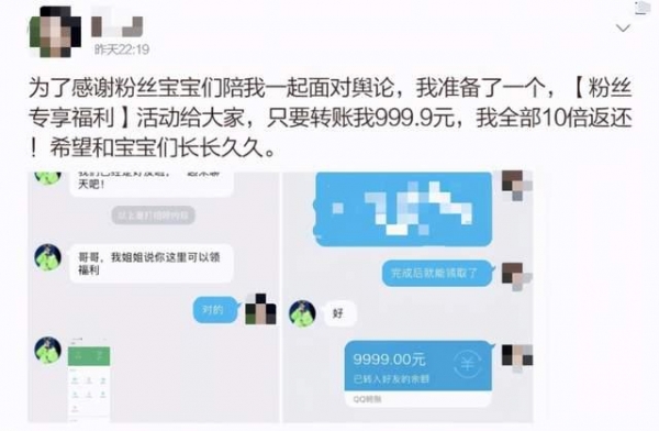 有骗子仿冒明星以“降热搜”等名义,直接向粉丝索要金钱,实则诈骗。