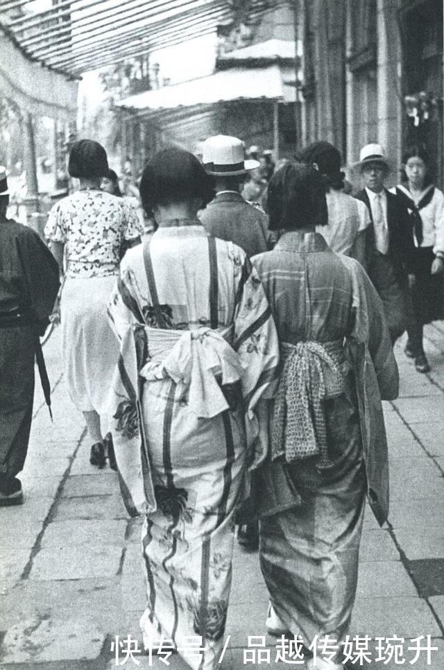 这是1933年的银座街拍。明治维新跟清朝洋务运动差不多同时进行,两国那些站在时代潮头的学者,都希望能在保持本国传统的基础上发展现代经济。因此,张之洞等人主张中体西用,在日本,则是和洋折衷。这张照片就很明显,近处的两人穿着和服,却已断发。她们左前的那个妹子,则干脆又断发又洋裙,毕竟,明治维新过了几十年,日本西化程度已极深了。