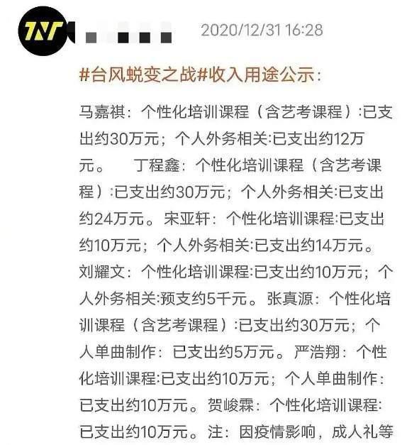 公司为了让粉丝放心,特意公布了打投明细。可以看到,马嘉祺得到了粉丝700万的打投费,当选组合C位出道,而700万中有 30万花在了他的平时个性化培训课程(含艺考课程)的补课上,还有10万用于个人外务费用上。