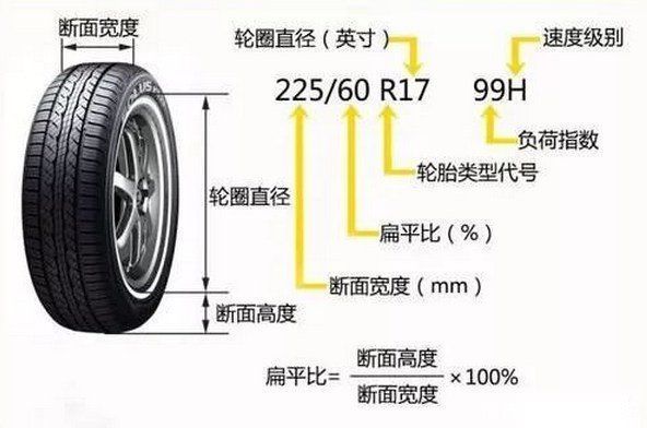 我们再来通过下图清晰的认识一下,轮胎上标记的各项含义。轮胎标记225/60R17 99H,其中225表示胎面宽225毫米,60表示扁平比60%(胎高÷胎宽),R代表轮胎属于子午线轮胎,17表示轮毂钢圈直径17英寸,99表示载重530公斤,H是速度代号表示最高安全速度是210公里/小时。