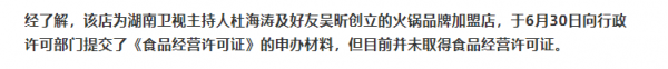 经媒体查询了解后,该店的确是湖南卫视主持人杜海涛吴昕所创立的火锅店,这家店铺在6月30日提交了《食品经营许可证》的申办材料,但目前并未取得。