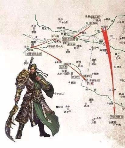 关羽的"过五关、斩六将"的路线,除了第一关"东岭关"是不知名的小地方外,其他四关在历史中确有其地的。其中,洛阳即今河南洛阳市附近;汜水关和荥阳都在今河南荥阳附近;"滑州"在今河省濮阳、滑县附近。从地图可以看出,这四个地方基本上是沿着黄河由西向东一字儿排开。其中洛阳、汜水关、荥阳均位于许昌(今河南省许昌市附近)的西北面,而滑州则位于许昌的东北。
