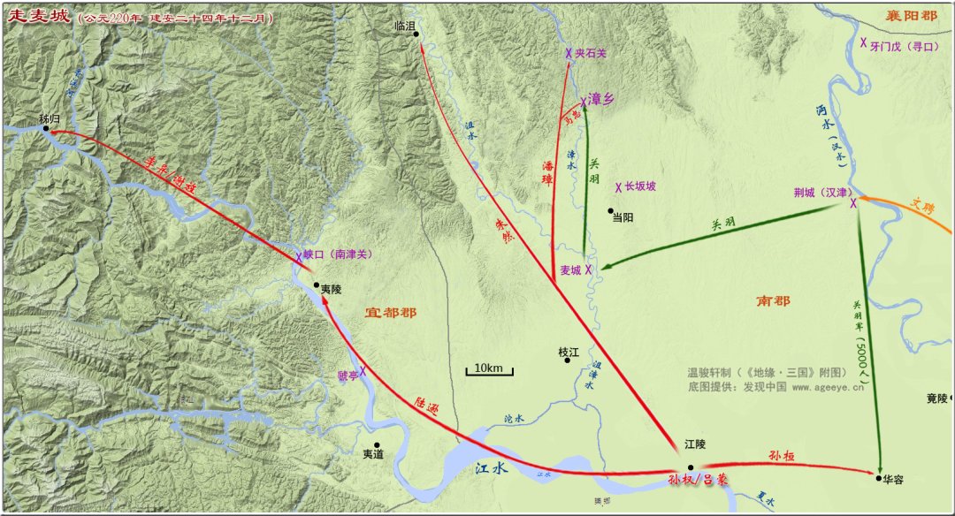 在当时,沮漳两水将交之处建有一座让人倍感沮丧的城邑——麦城。听到这个名字大家就知道,关羽才是麦城笼罩上一层阴影的根源。沮漳两水的源头都位于房陵境内,这当中沮水的源头与房陵核心河流筑水的源头相邻,沮水河谷又相对较为宽阔,因此于河谷当中建制有“临沮县”(湖北省南漳县)。当日乐进就曾从关羽手上夺取过临沮,再后来魏国得到东三郡后,还是又拿回临沮置于襄阳郡中,以免东吴从临沮北上觊觎房陵。