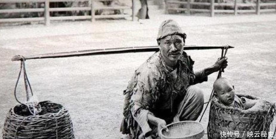 晚清老照片:官员当众跪拜洋人,溥仪和婉容紫禁城接待日本人。图为晚清时期一个乞丐带着儿子四处去乞讨,看起来十分可怜。