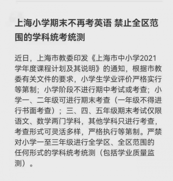 刚刚传来重大消息:上海小学期末不再考英语,禁止全区范围的学科统考统测!