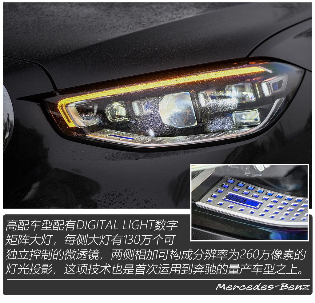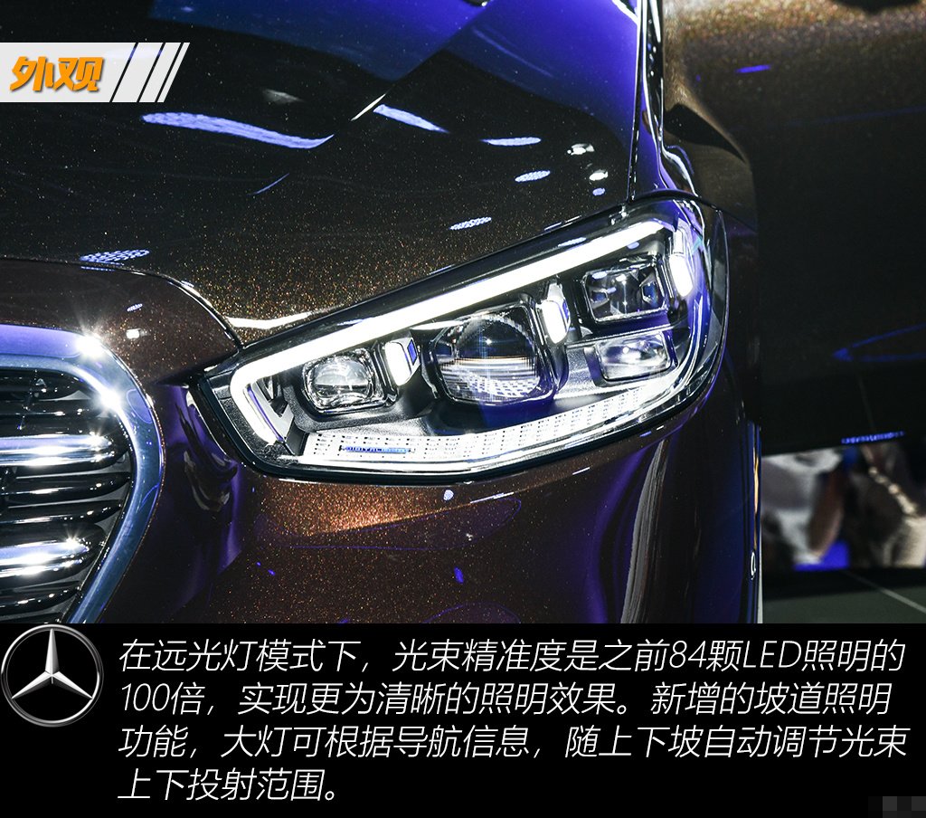 赋予照明系统以先端智能。每侧130万像素的智能数字大灯,可根据道路情况实现精准的光束分布,令前路时刻清晰,并在会车时防止对方驾驶者眩目。解锁车辆时,大灯将通过独特的数字流星雨迎接驾驶员,并在锁止车辆时向驾驶员告别。全新"流星雨"数字大灯首次应用于梅赛德斯-奔驰量产车型中,延续自第十代S级轿车的"三道杠"点阵式设计如同身份象征徽章,极具辨识度,通过260万像素的数字微镜技术,实现"流星雨"仪式感与高度精确的光束分布;在远光灯模式下,光束精准度更达之前84颗LED照明的100倍,更新增坡道照明功能,可根据导航信息随上下坡自动调节光束投射方向,从而确保光束能够时刻清晰照亮路面情况。车辆尾部,"湖光楼影"水平延展双段式尾灯构造精美,内置有如湖光广厦般的矩阵式灯组,点亮时更伴有动态效果,夜色之中,一眼便知。