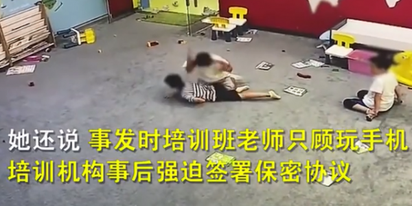 最后,培训班老师才到门口看了一眼情况,把孩子送进了医院,但当时老师手里还拿着手机。
