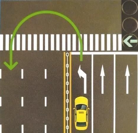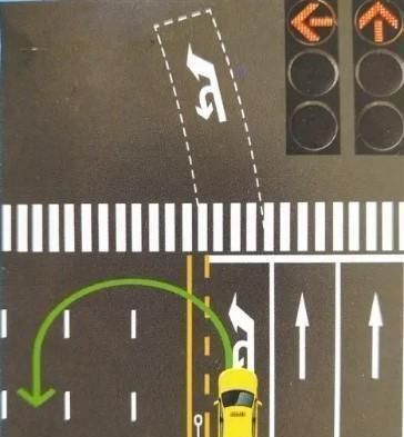 B、在设置了转弯等待区域的普通交叉路口,汽车遇到直行绿灯时,直行进入待转区域,左转灯点亮时掉头行驶。