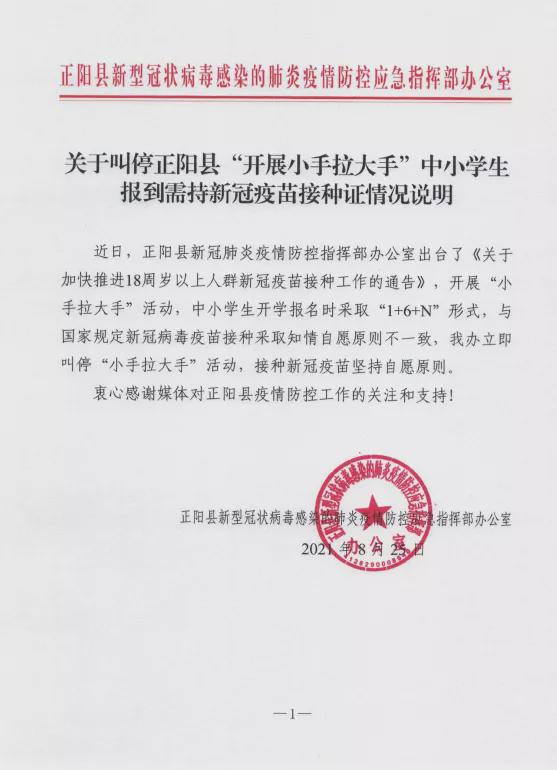 据“掌上驻马店”微信公号8月26日消息,正阳县新型冠状病毒感染的肺炎疫情防控应急指挥部办公室25日发布情况说明指出,近日,正阳县新冠肺炎疫情防控指挥部办公室出台了《关于加快推进18周岁以上人群新冠疫苗接种工作的通告》,开展“小手拉大手”活动,中小学生开学报名时采取“1+6+N”形式,与国家规定新冠病毒疫苗接种采取知情自愿原则不一致,该办立即叫停“小手拉大手”活动,接种新冠疫苗坚持自愿原则。