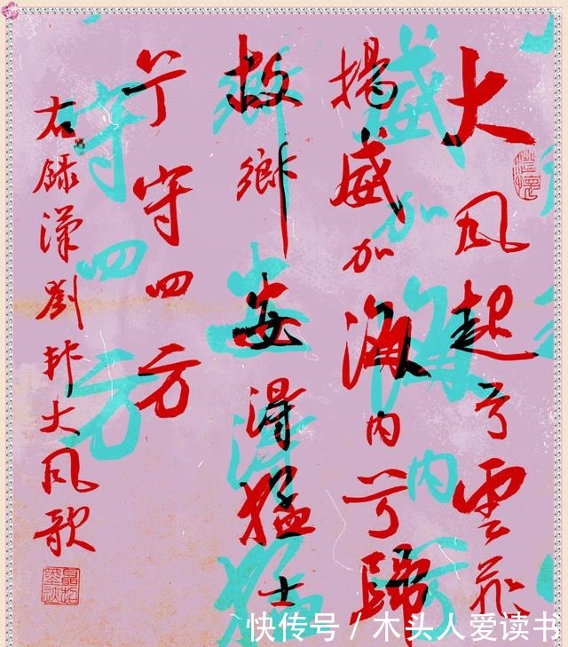 "威加海内兮归故乡",这一句写刘邦一统天下荣归故里时的那种八面威风的情景。元代睢景臣在《哨遍·高祖还乡》一曲中再现了刘邦当时衣锦还乡、前呼后拥的场面:"见一颩人马到庄门,匹头里几面旗舒。一面旗白胡阑套住个迎霜兔,一面旗红曲连打着个毕月乌。一面旗鸡学舞,一面旗狗生双翅,一面旗蛇缠葫芦。""红漆了叉,银铮了斧,甜瓜苦瓜黄金镀,明晃晃马镫枪尖上挑,白雪雪鹅毛扇上铺。这些个乔人物,拿着些不曾见的器仗,穿着些大作怪的衣服。"先是威风凛凛的仪仗队引路;"辕条上都是马,套顶上不见驴,黄罗伞柄天生曲,车前八个天曹判,车后若干递送夫。更几个多娇女,一般穿着,一样妆梳。"接着是前呼后拥的侍从;"那大汉下的车,众人施礼数,那大汉觑得人如无物。众乡老展脚舒腰拜,那大汉挪身着手扶。"最后是主人公出场。"那大汉觑得人如无物","那大汉"就是刘邦,"觑(即看)得人如无物",刘邦那目空一切的神态,是何等威风!一个"威"字不仅形象地表明了各大诸侯臣服于刘邦的脚下无上之威,也表明了他荣归故里时的心情是何等的荣耀与八面威风!一二句雄豪自放,使他那种兴奋、狂放、踌躇满志、充满王霸之气心情溢于言表。
