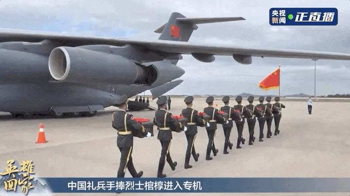 一次、两次、三次,每一次的弯腰都庄重而有力,随后,当中方礼兵再次捧起志愿军烈士遗骸的棺椁,向中国空军的运-20专机走去时,现场庄严的军乐响起。