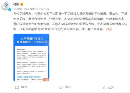 花呗表示,按照征信工作要求,在获得用户授权的基础上,花呗向征信系统报送的信息包括账户开立日期、授信额度、额度使用及还款情况等。