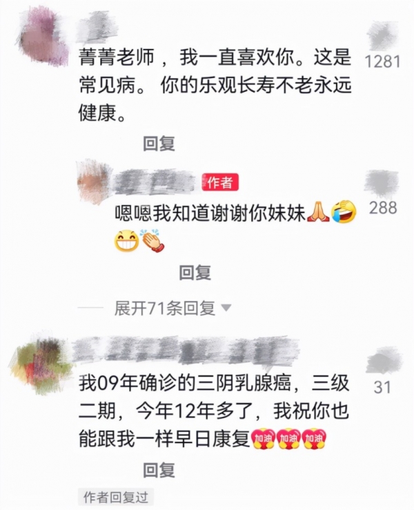 动态公布之后,不少粉丝在评论区留言为她加油,直言乐观就是长寿不老的秘诀,还有患过相同病症的网友为李菁菁鼓劲,希望她能早日康复,留言区画风十分温馨。