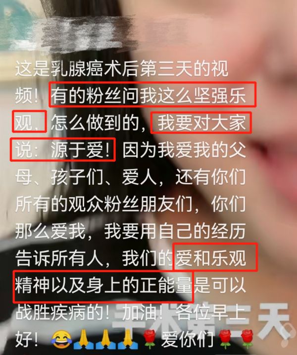 近日,演员李菁菁在社交平台上晒出一段视频,并配文称是她乳腺癌术后第三天录制的,有的粉丝问她为什么能做到这么坚强乐观,她透露一切都是因为爱,这些正能量是可以战胜疾病的。