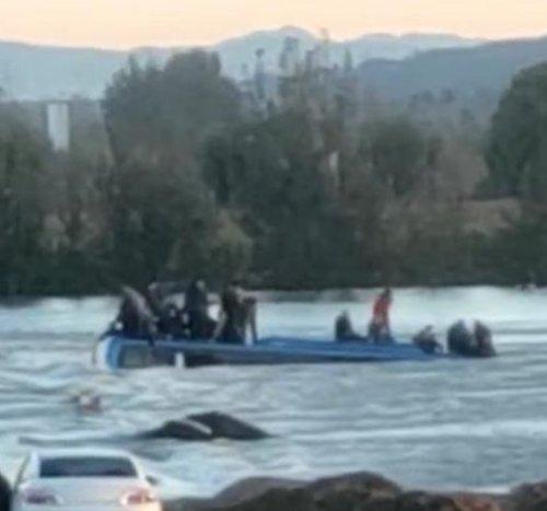 10月11日,石家庄平山县一大巴车坠入河中,现场多人站车顶等待救援。